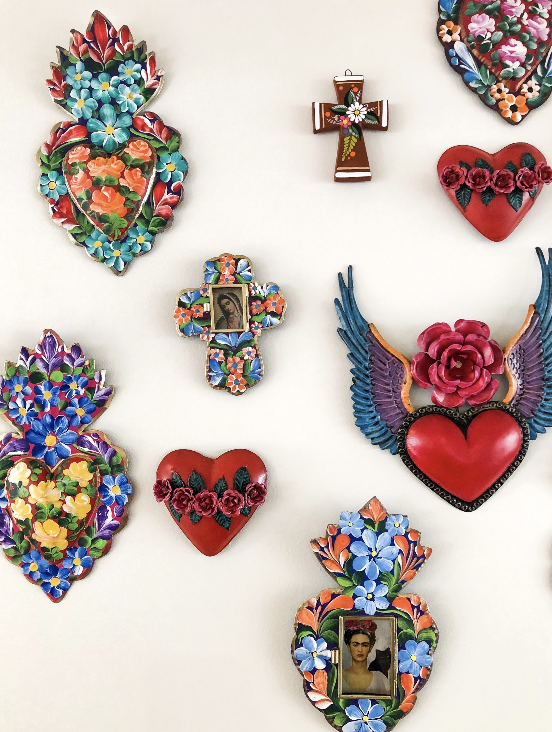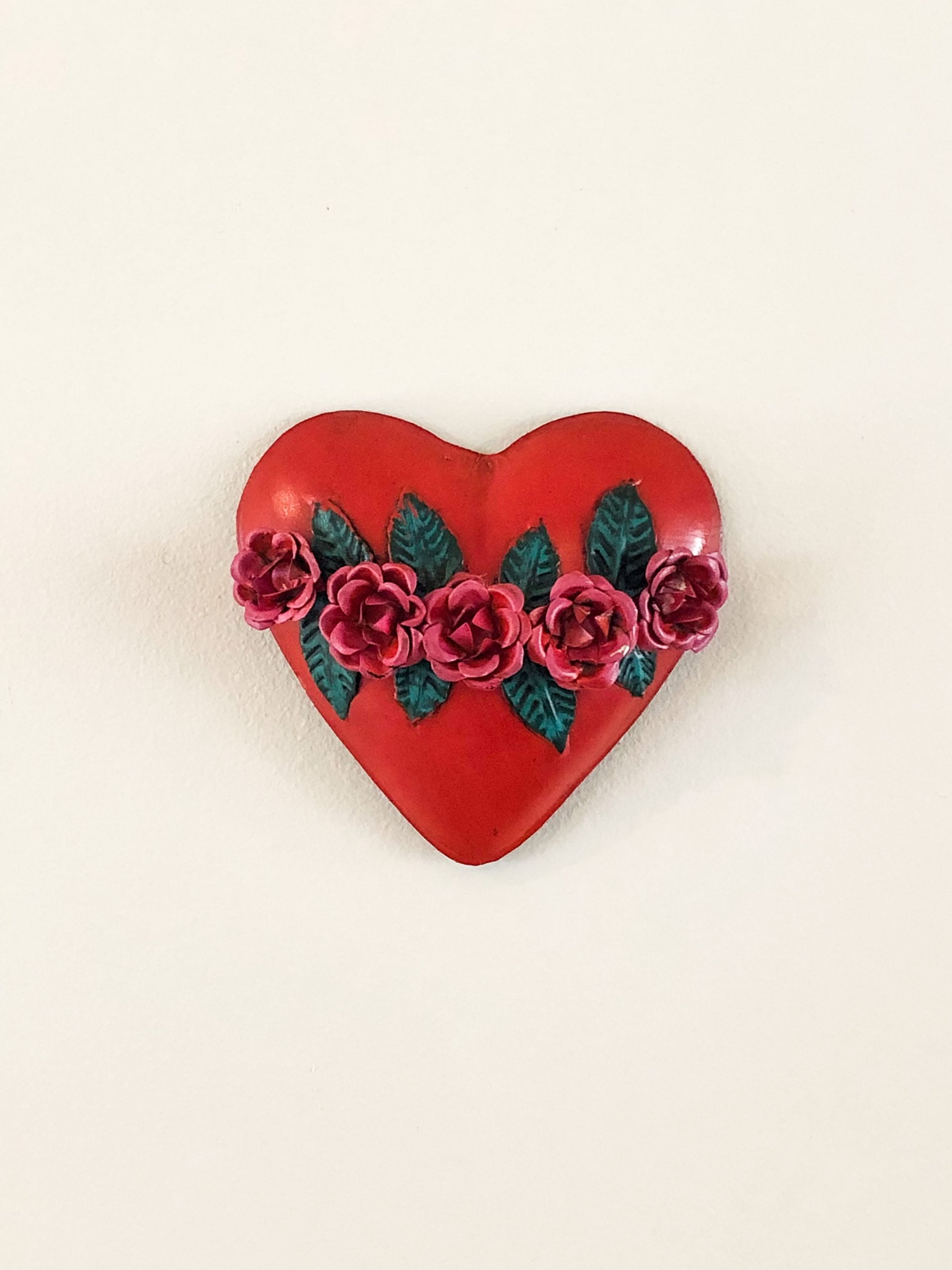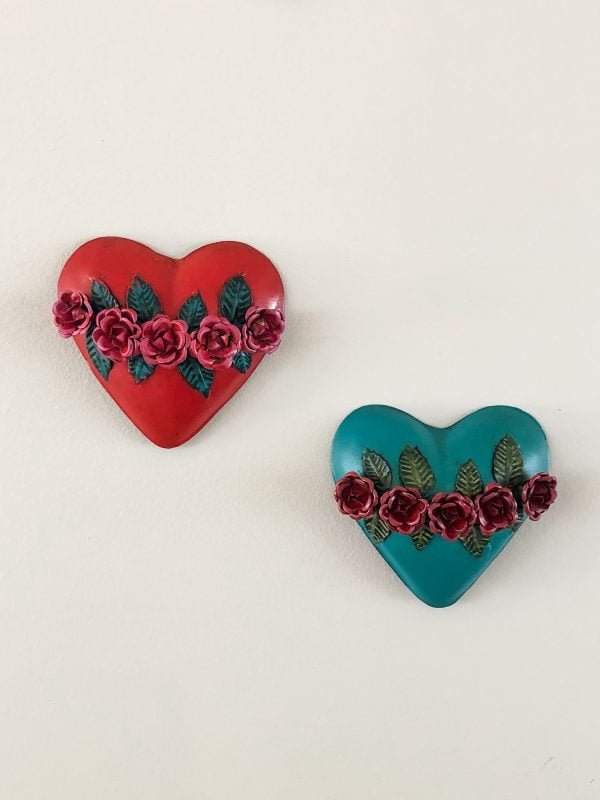 Hand painted tin sacred heart with beautiful roses, sourced from Mexico. The sacred heart is one of the most common motifs in religious folk art created in Mexico. It represents the physical heart of Jesus as a symbol of his divine love for humanity. Due to the hand crafted nature of each item, colours and patterns may vary from the images shown.